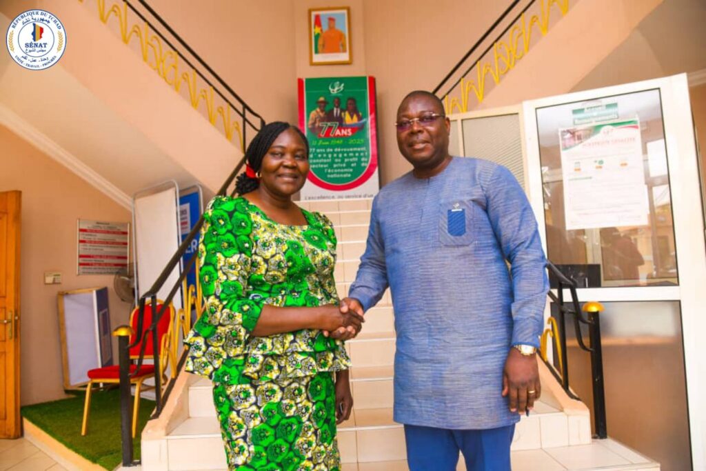 En marge de la 14ᵉ édition du Forum International des Femmes Entreprenantes et Dynamiques (FIED), la délégation tchadienne conduite par Lydie BEASSEMDA, 2ᵉ Vice-présidente du Sénat, a effectué une visite d’échange auprès du Président de la Délégation spéciale de la Chambre de Commerce et de l’Industrie du Burkina Faso. Cette rencontre de haut niveau s’est tenue en présence de M. Mahamat Saleh Adoum Ahmat, Ambassadeur du Tchad au Burkina Faso, soulignant l’importance stratégique accordée par les deux pays à la coopération économique et institutionnelle.