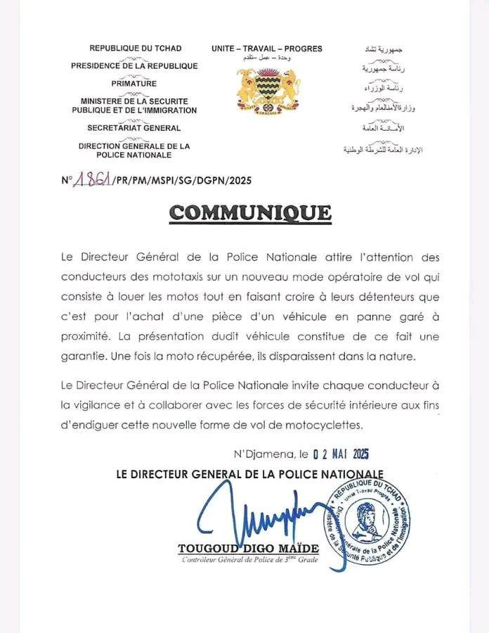 La Direction Générale de la Police Nationale du Tchad, par la voix de son Directeur Général Tougoud Digo Maïdé, alerte les conducteurs de mototaxis sur une nouvelle forme de vol en pleine expansio à N’Djamenan. Dans un communiqué officiel datant du 2 mai mais diffusé ce dimanche 27 juillet 2025, les autorités mettent en garde contre un stratagème de plus en plus utilisé par des malfaiteurs se faisant passer pour de potentiels clients.